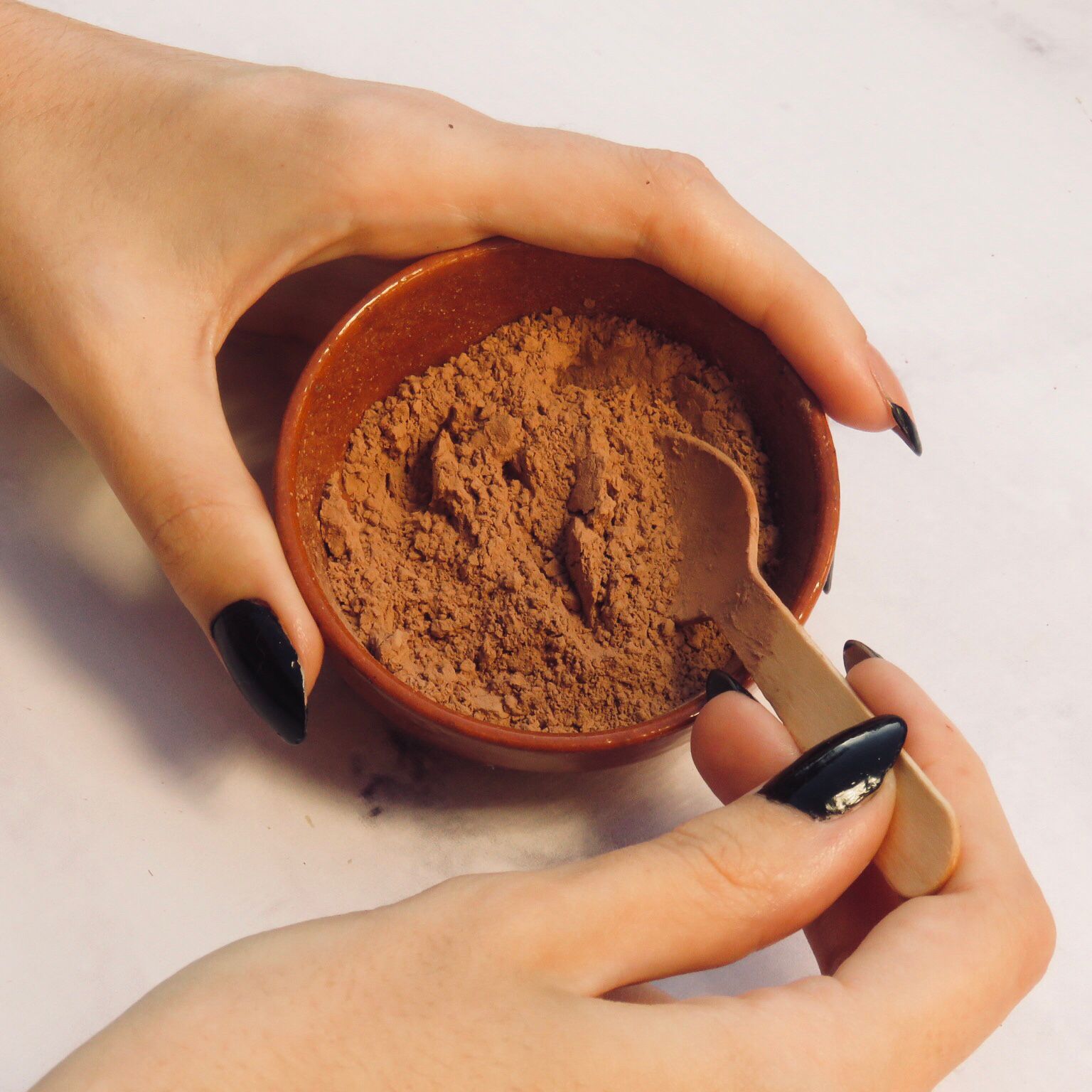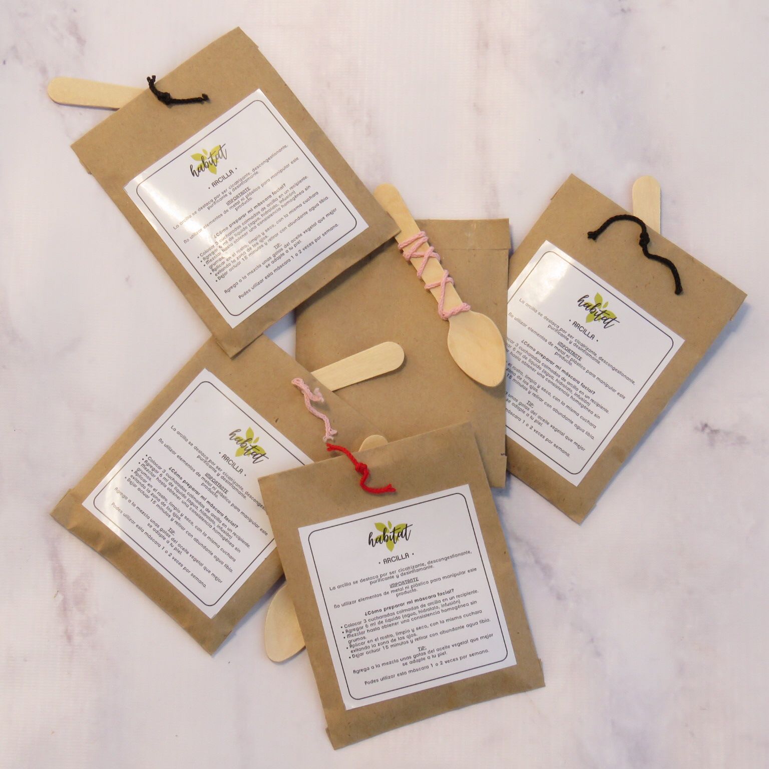 Nuestras arcillas vienen en bolsitas hechas a mano de papel kraft con una etiqueta explicativa y una cuchara de bambú.